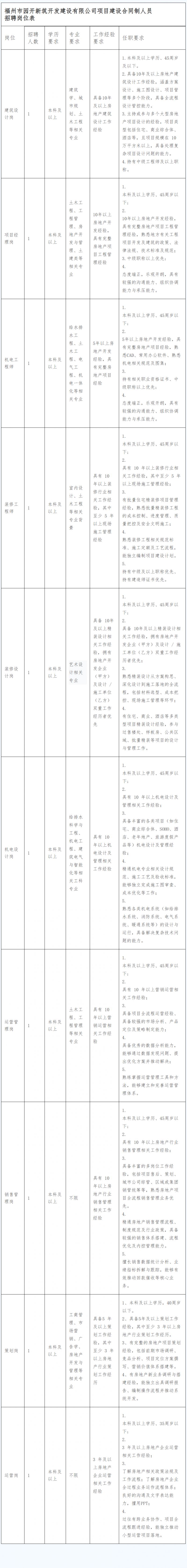 福州市园开新筑开发建设有限公司为福州工业园区开发集团有限公司全资子公司,经营范围包括房地产开发经营、住房租赁、非居住房地产租赁、办公设备租赁服务、物业管理、物业服务评估等。因业务发展需要,公开招聘如下岗位(详见招聘岗位表附件1),现将有关事项公告如下: