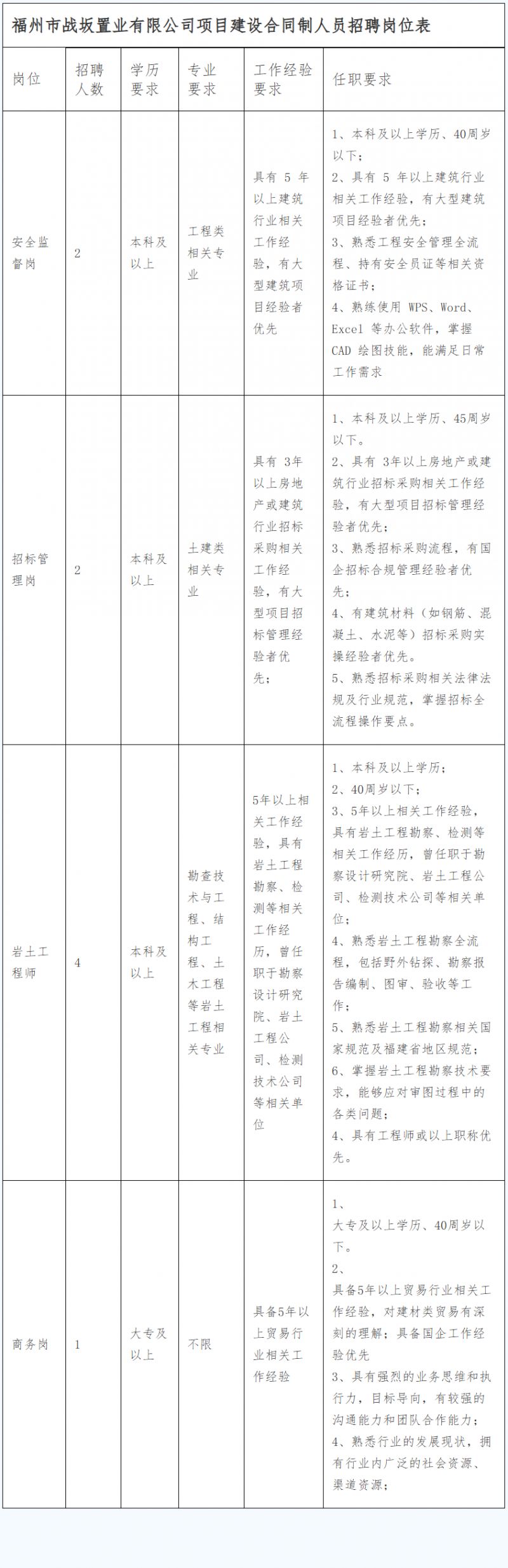 福州市战坂置业有限公司为福州工业园区开发集团有限公司全资子公司,经营范围包括房地产开发经营、住房租赁、非居住房地产租赁、办公设备租赁服务、物业管理、物业服务评估等。因业务发展需要,公开招聘如下岗位(详见招聘岗位表附件1),现将有关事项公告如下:
