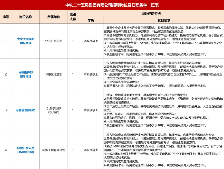 详见《中铁二十五局集团有限公司招聘岗位及任职条件一览表》(附件1)。