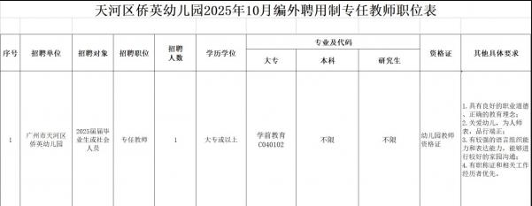 1. 广州市天河区侨英幼儿园2025年10月编外聘用制专任教师职位表