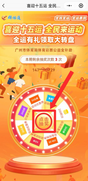 广大市民、嘉宾、游客,可通过“群体通”微信小程序活动页面,参与“全运有礼”惠民转盘抽券活动,有机会随机抽取到免费券和30元、20元、10元、5元优惠券等福利,凭券线上预订,300家惠民开放社会体育场馆,可享受价格减免优惠。