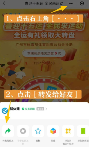 3.在小程序页面点击右上角【···】,将活动信息转发给好友群,可额外增加1次抽奖机会。