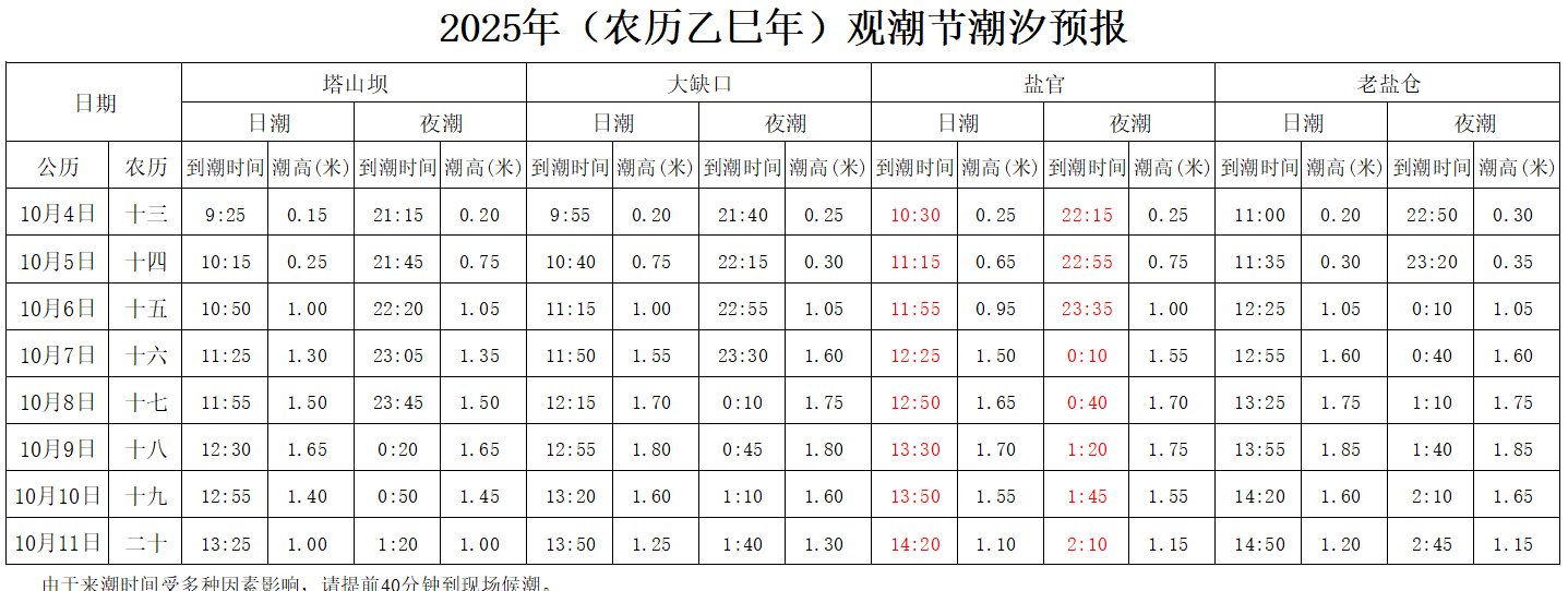 五、2025年观潮节潮汐预报